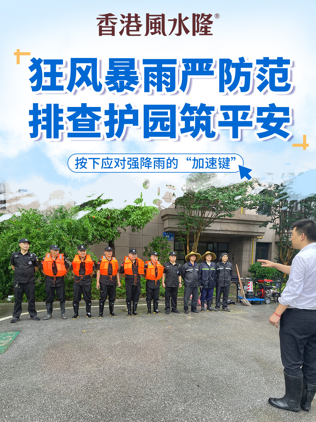 8 月初,台风携强暴雨蓄势待发,气象预警一出,风水隆智慧服务立刻拉满防汛警报。考虑到强暴雨天气随时可对园区环境造成影响,风水隆物业团队迅速行动,对楼栋进行逐一排查,确保公共区域门窗紧闭,并提醒业主们关紧门窗,做好防护措施,避免强风袭入造成的重大损失。