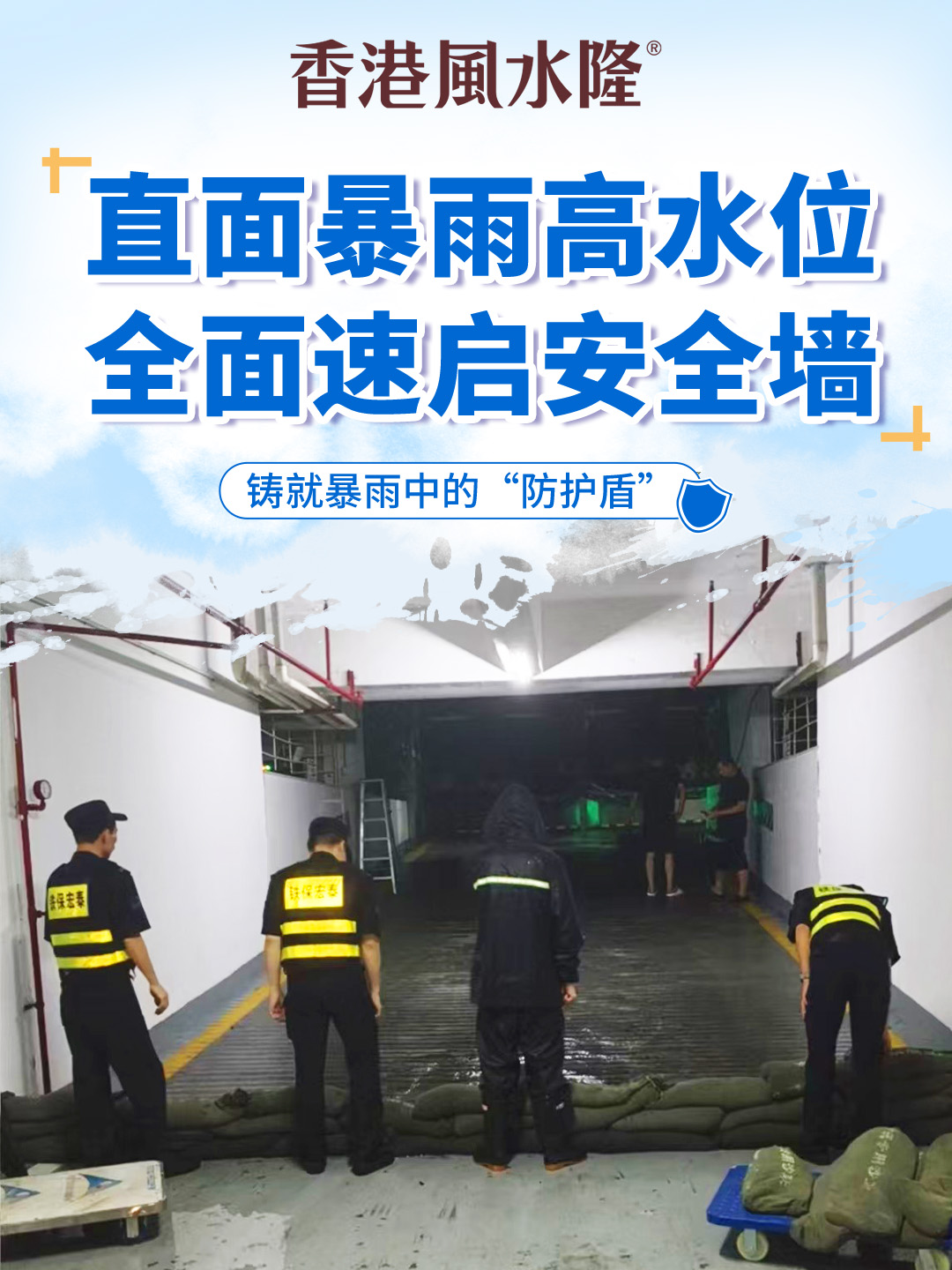 暴雨如注,风水隆物业秩序部的工作人员早已在地下车库严阵以待。随着暴雨持续,地下车库水位以肉眼可见的速度攀升,排水系统面临巨大压力。风水隆团队迅速响应,开启全方位应急举措,展开险情巡查、垒砌沙袋等防汛工作,全力以赴筑牢防汛安全防线,守护着整个园区的安全。