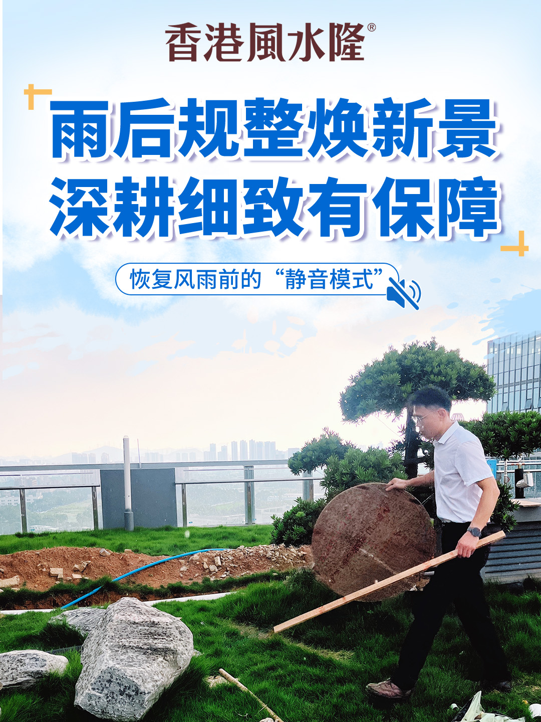 风雨初歇,风水隆智慧服务又紧急投入场景恢复与防汛收尾工作。风水隆物业工作人员在屋顶花园,手持长杆,稳健发力,将被风雨挪动的大石重新归位,规整那些因狂风移位的竹木。认真检查绿植有无倒伏、设施是否稳固,以实际行动恢复园区原本景致,细致专注,逐步重归有序与安宁,用责任守护业主生活环境。
