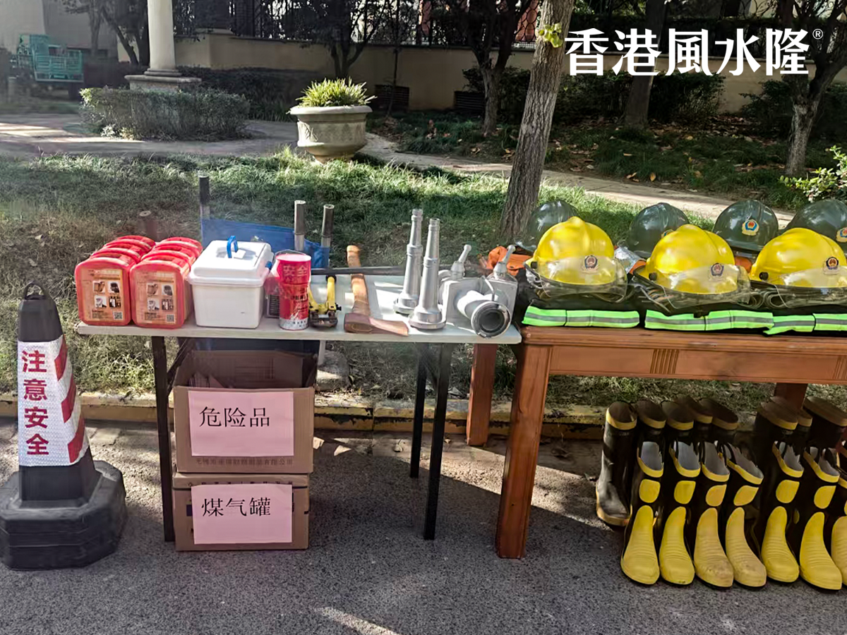 刚到集合点,风水隆物业团队早已摆好了“教学阵仗”——灭火器、应急面罩等各类消防用具整齐排列。